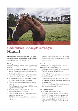 Häststall Det finns många brandrisker i stall. Här följer några tips om hur du kan förebygga brand i stallet och vad du ska göra om det ändå börjar brinna. Ladda ner (pdf) |