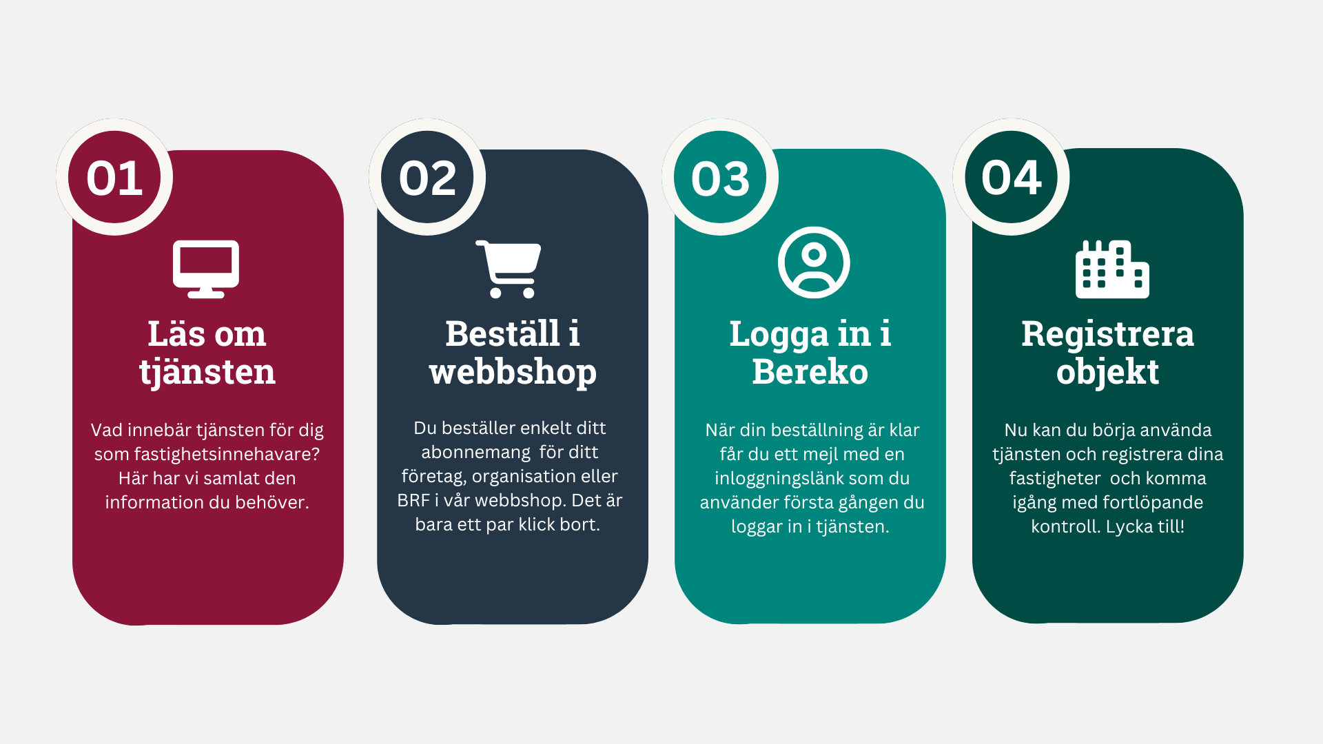 Bereko är en målgruppsanpassad tjänst för dig som fastighetsinnehavare som både effektiviserar och gör ditt arbete enklare samtidigt som elsäkerheten i dina fastigheter stärks. Vi har gjort det enkelt för dig att komma igång.