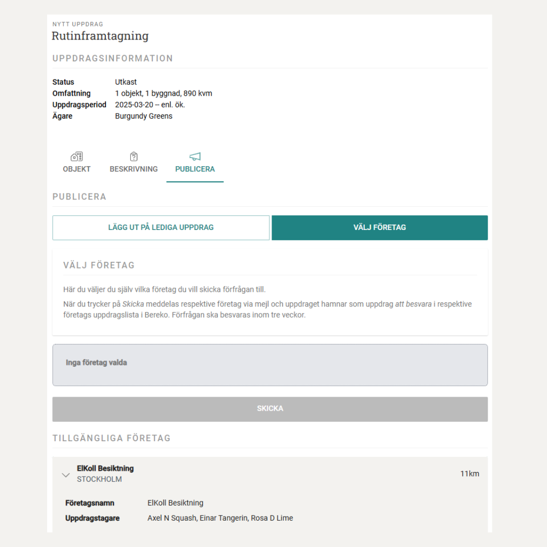 Du kan välja en eller flera att skicka uppdragsförfrågan till. Du får upp en lista med företagen med avståndberäkning från adressen du anger där uppdraget ska utföras.