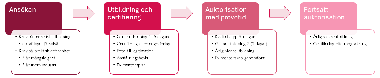 - Vid godkänd ansökan kallas du till en 5 dagars grundutbildning i Stockholm med efterföljande kunskapsprov. Saknar du certifiering inom eltermografering enligt norm SBF 1031:3, minst klass 1, behöver du även komplettera med det. Utbildning för detta erbjuds av Brandskyddsföreningen.