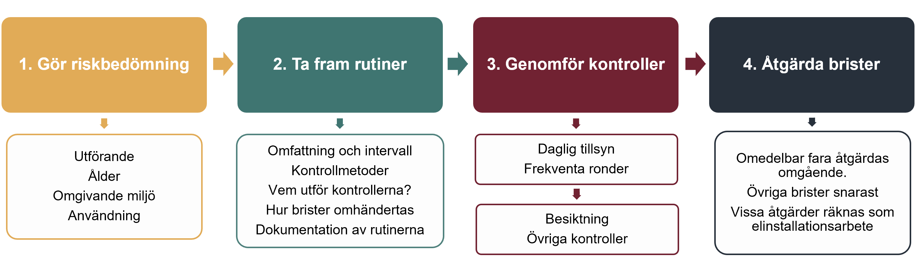 Syftet med kontrollerna är att upptäcka fel eller brister så att risken för skador på personer och egendom minskas. En del i ansvaret är att ta fram och dokumentera rutiner för vilka kontroller som ska genomföras. Dessa rutiner ska baseras på en riskbedömning av anläggningen. Se vår film om fortlöpande kontroll.