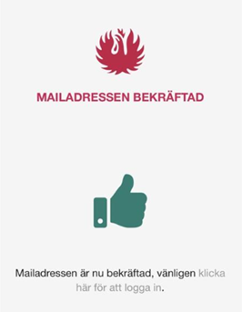 Steg 7: Mailadressen är nu bekräftad. Klicka på länken ”Klicka här för att logga in”, om du inte redan har blivit inloggad. För att logga in med BankID, se instruktioner här >