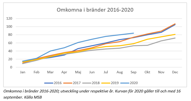 2020.09.22. Antalet omkomna i dödsbränder är det högsta på länge. Hittills i år har 83 personer omkommit enligt preliminära siffror, vilket är det högsta antalet på många år under motsvarande period. Som en jämförelse omkom 81 personer i dödsbränder under hela 2019 och 72 personer omkom under 2018.