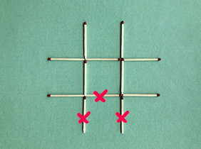 Flytta tändstickorna längst ner, den ena till vänsterkanten och den andra till högerkanten. Flytta upp tändstickan i mitten. | |
