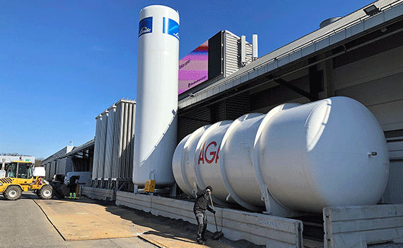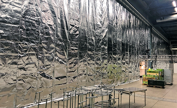 – När det var färdigt såg det ut som en jättestor vägg av aluminiumfolie. Det handlade om problemlösning på hög nivå från de som levererade den. I vanliga fall jobbar de med mindre delar som används under byggtid. Nu blev allt väldigt uppskalat, när de skulle täcka en hel mässhall, säger Olga Nilsson.