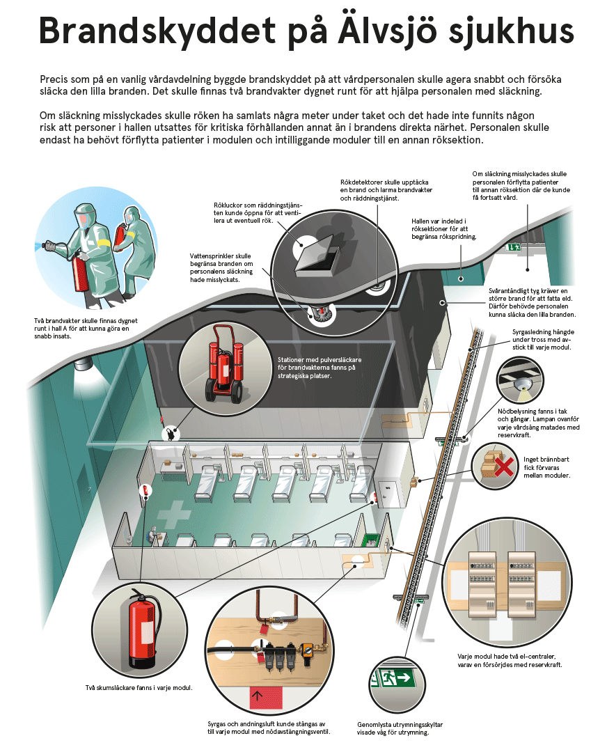 I slutändan lyckades de få till ett brandskydd som var acceptabelt och som möjliggjorde en effektiv insats från räddningstjänsten vid en eventuell brand. Hur det till slut fungerade i praktiken fick vi aldrig veta, då sjukhuset inte behövdes tas i bruk utan avvecklades under sommaren.