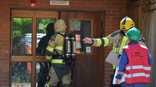 Deltagarna sätter på sig västar i olika färger som klart och tydligt visar vilken roll var och en har. När larmet går tar det inte många minuter innan en beredskapsstyrka från räddningstjänsten och ambulans är på plats. Eftersom plåtslagaren som befann sig på taket har ramlat måste han räddas först innan brandmännen kan påbörja arbetet med att släcka. Museipersonalen ser till att brandmännen får föremålskorten som hör till de prioriterade föremålen så att de kan plockas ut i första hand. När branden väl är släckt och situationen under kontroll övergår ansvaret till gruppen.